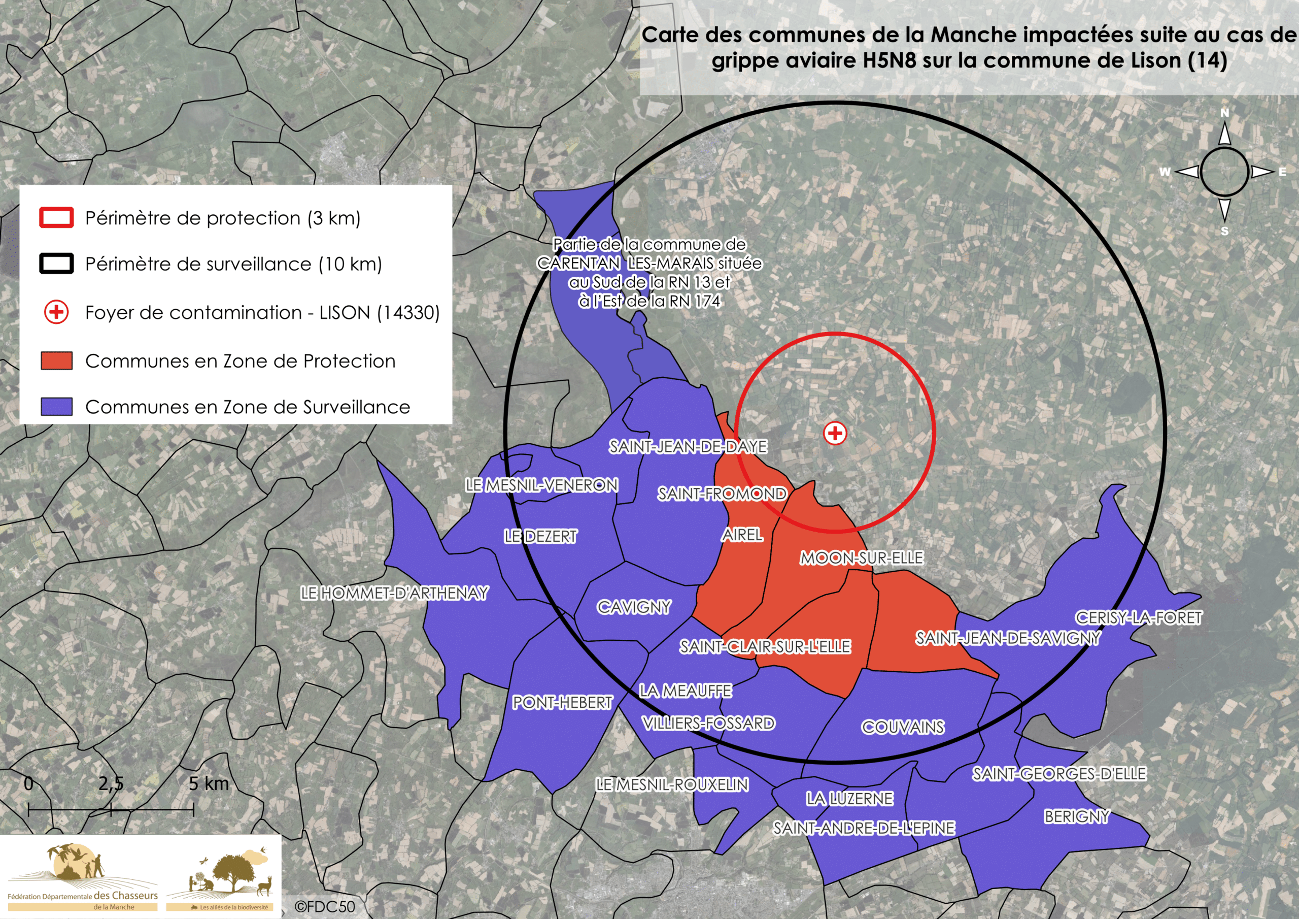 Il est confirmé que la chasse au gibier d’eau reste autorisée sur les communes comprises dans la Zone de Surveillance et interdite dans la Zone de Protection (cf. carte ci-dessous), suite à une dérogation de l’arrêté du 15 décembre 2025.